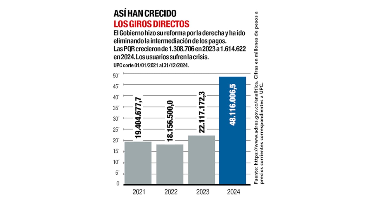 “Los Giros Directos del Régimen Subsidiado ascendieron de 21,06 billones de pesos en 2023 a 28,6 billones en 2024, representando un incremento del 36,05 por ciento. Respecto al Régimen Contributivo, los Giros Directos pasaron de 1,04 billones en 2023 a 19,4 billones en 2024, representando un crecimiento del 1.754,08 por ciento”, sostiene el documento.