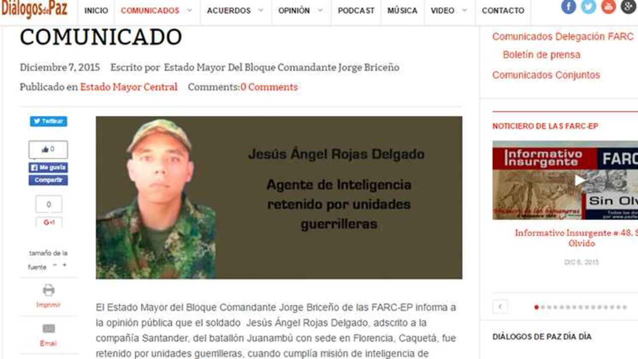 En un corto comunicado la guerrilla de las FARC confirmó este lunes que tiene en su poder al soldado bachiller Jesús Rojas Delgado.