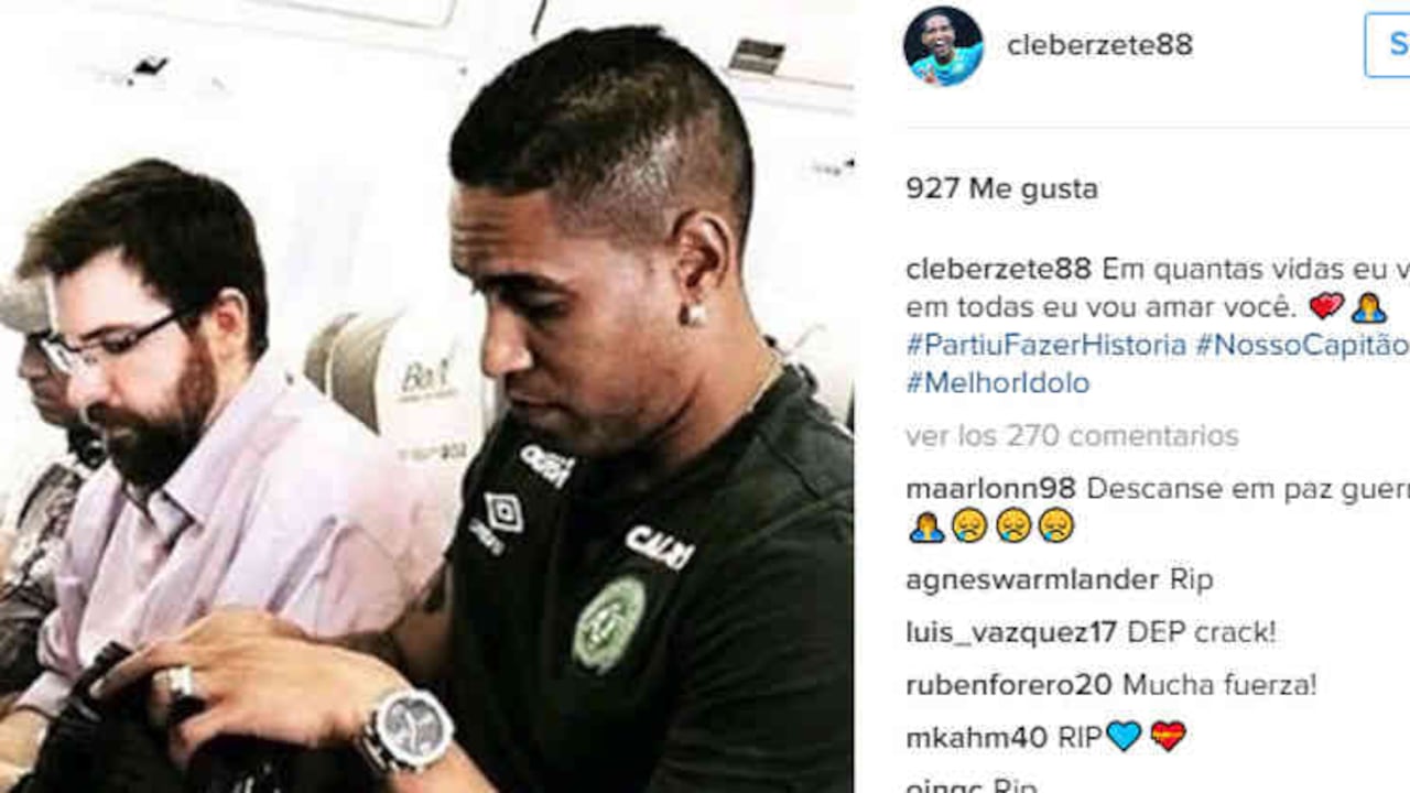 Minutos antes de despegar en el avión que se estrelló en Antioquia, el mediocampista del equipo brasilero Chapecoense Cléber Santana Loureiro escribió un mensaje de amor que resultó un mensaje póstumo. "En cuantas vidas yo viva, en todas te amaré", compartió en sus redes sociales. Cléber es recordado por haber jugado en el 2007 para el Atlético de Madrid, escuadra en la que duró dos años. En España también jugó para el Mallorca. En el 2015 llegó al Chapecoense.
