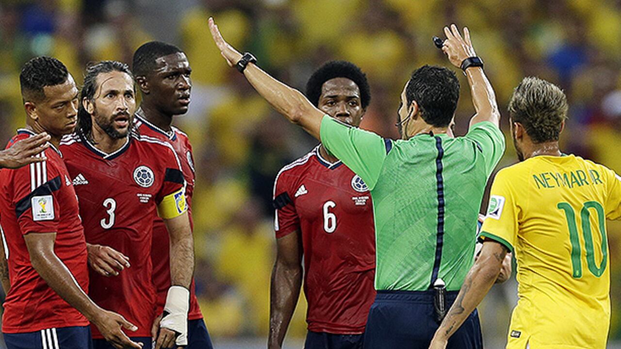 El partido fue el más sucio del Mundial y, después de 41 faltas, Velasco solo sacó una amarilla. Esa noche, en Fortaleza, el español habría podido fácilmente mostrar tres rojas: una a Ferandinho, quien le pegó a James sin parar; una a Julio Cesar por el penalti y una a Camilo Zúñiga, por la lesión de Neymar.
