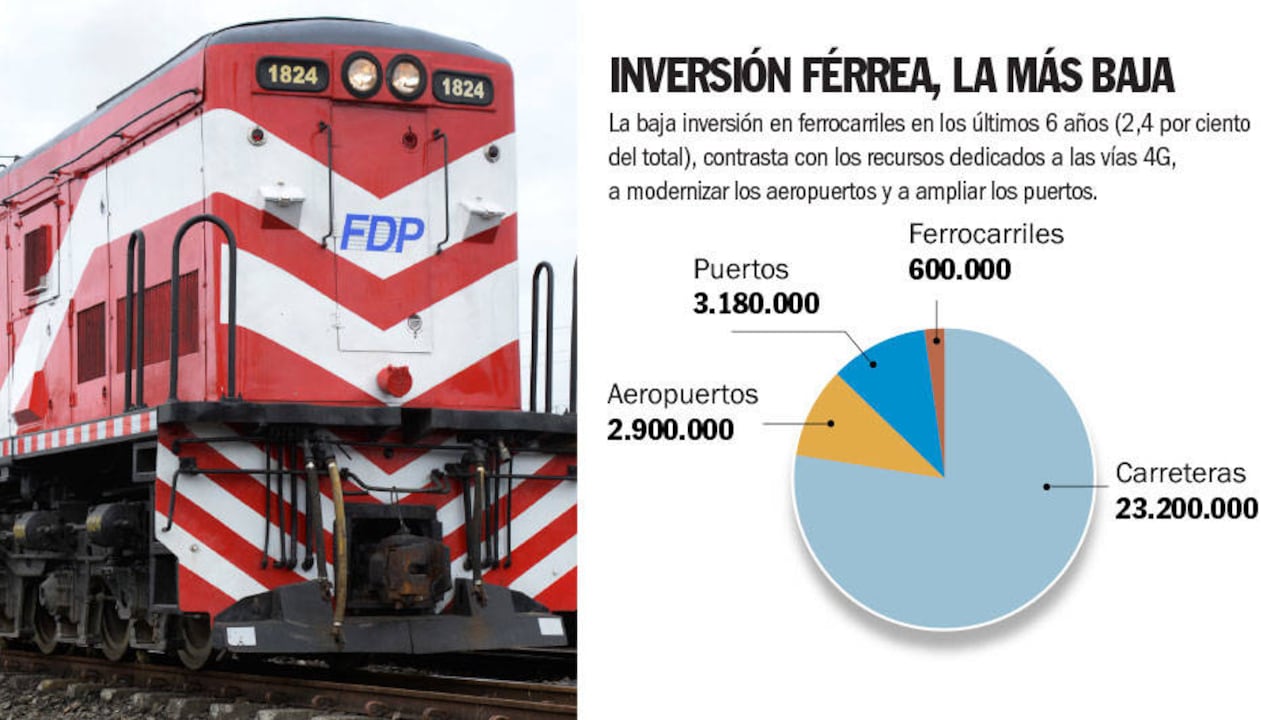 Mientras las inversiones en carreteras, aeropuertos y puertos durante los últimos 6 años se cuentan en billones, la inversión en ferrocarriles entre 2011 y 2017 no alcanza los 650.000 millones de pesos. Esto representa tan solo el 2,4 por ciento de todo lo invertido en este periodo, lo cual convierte al modo férreo en el gran lunar de la infraestructura en Colombia.