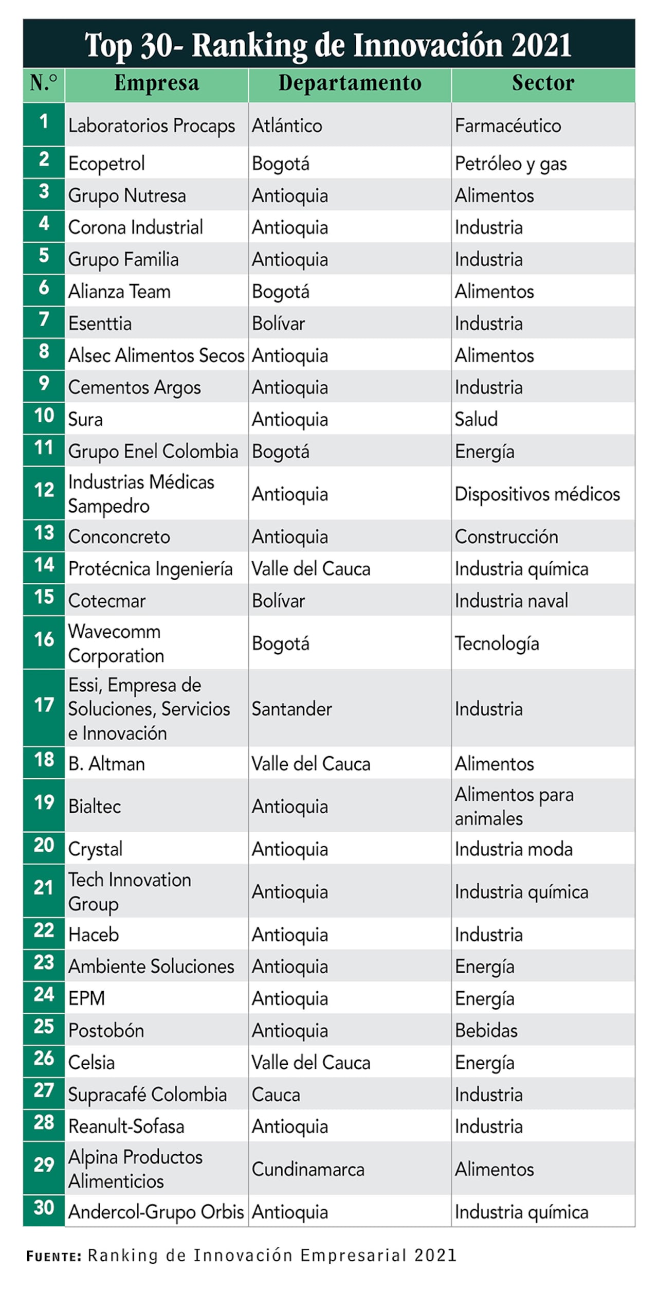Laboratorios Procaps, Ecopetrol, Nutresa, Corona Industrial y Grupo Familia son hoy las cinco empresas más innovadoras del país, según el estudio de la Andi. Todas han venido fortaleciendo sus procesos de innovación, aunque vale la pena destacar el caso del Grupo Familia, que en los últimos cinco años ha sido la empresa que más ha avanzado en el listado, al pasar del puesto 25 en 2017 al quinto hoy. Algo similar ocurre con Alianza Team, que pasó de la casilla 14 a la 6. Como Apple, estas compañías están demostrando que la innovación va mucho más allá que la invención y con sus desarrollos no solo crean valor para sus accionistas y empleados, sino para todo el país.