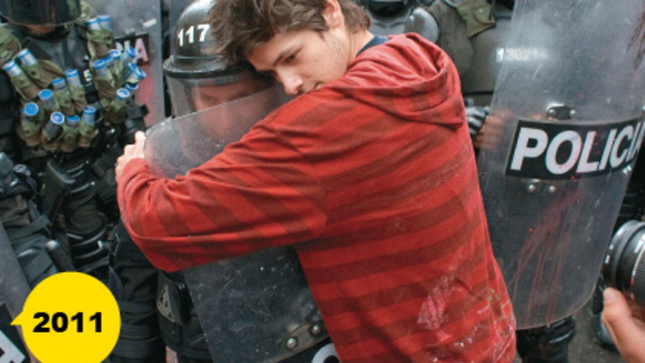 En noviembre de 2011, durante la marcha de protesta del movimiento estudiantil contra la reforma de la Ley 30, el gobierno y el Esmad se encontraron con claveles y abrazos. No con piedras o papas bomba. Los pocos que intentaron generar violencia fueron silenciados por jóvenes como Carlos Acosta. Su gesto al abrazar a uno de los patrulleros les demostró que su lucha era otra. “Muchos hicieron lo mismo y Colombia vio que podemos protestar en paz”, recuerda. Pedro Valenzuela, el agente, se sorprendió con el abrazo del universitario. Hoy dice que espera que actos como ese ayuden a mejorar la imagen de los estudiantes… y también la de los policías.