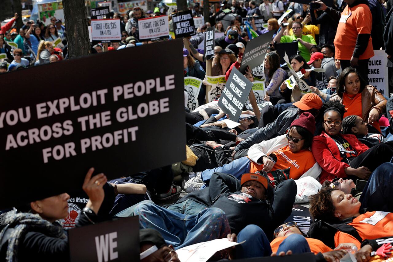 Los manifestantes exigen mayores pagos frente a un McDonald's de Nueva York. Los organizadores de la protesta afirman que se trata de la movilización de trabajadores más grande de Estados Unidos. (AP)