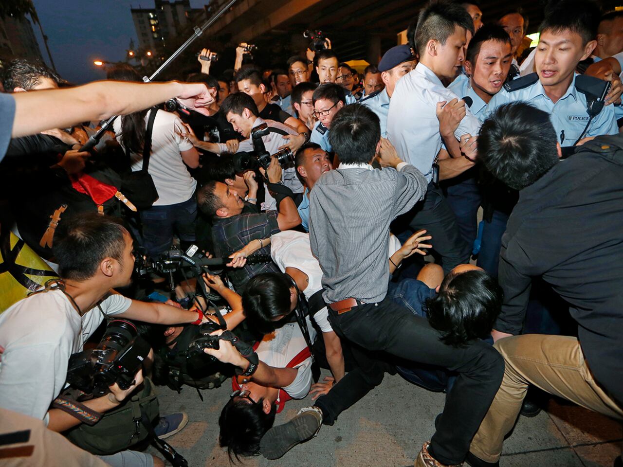 Los manifestantes prodemocracia y los fotógrafos caen al suelo luego de que fueran empujados por la policía mientras que el jefe ejecutivo de Hong Kong, Leung Chun-ying, se unía a una manifestación para apoyar la reforma del gobierno. (AP)