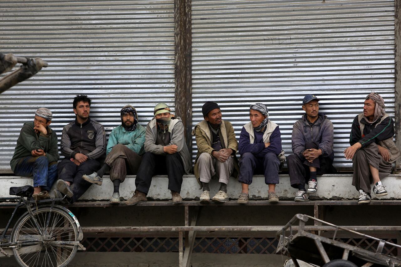 Los trabajadores afganos esperan a sus clientes en Kabúl, Afganistán. (AP)