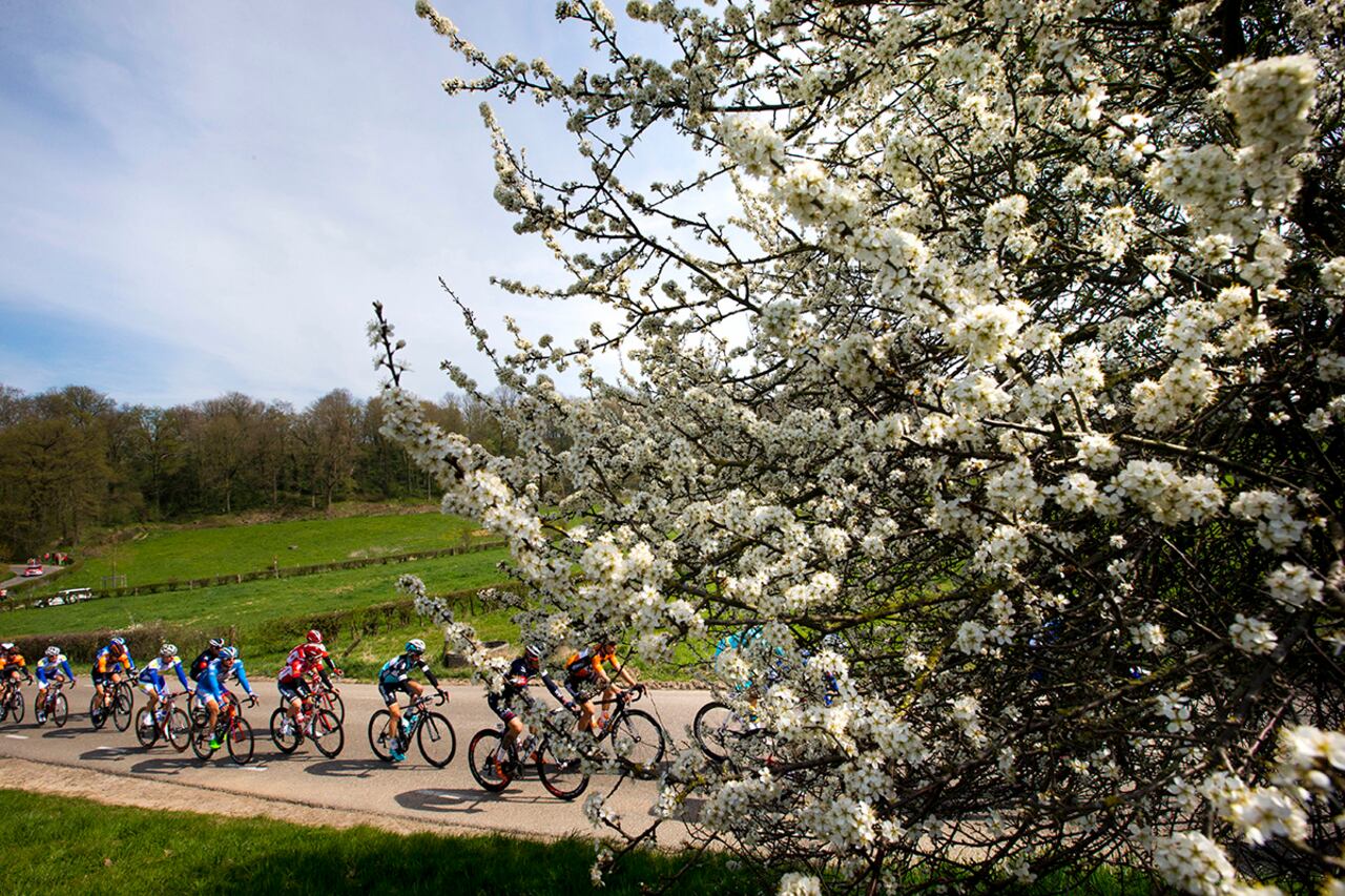 El grupo de ciclistas pasa por los árboles florecientes durante la competencia de ciclismo de Amstel Gold en Valkenburg, Países Bajos. (AP)