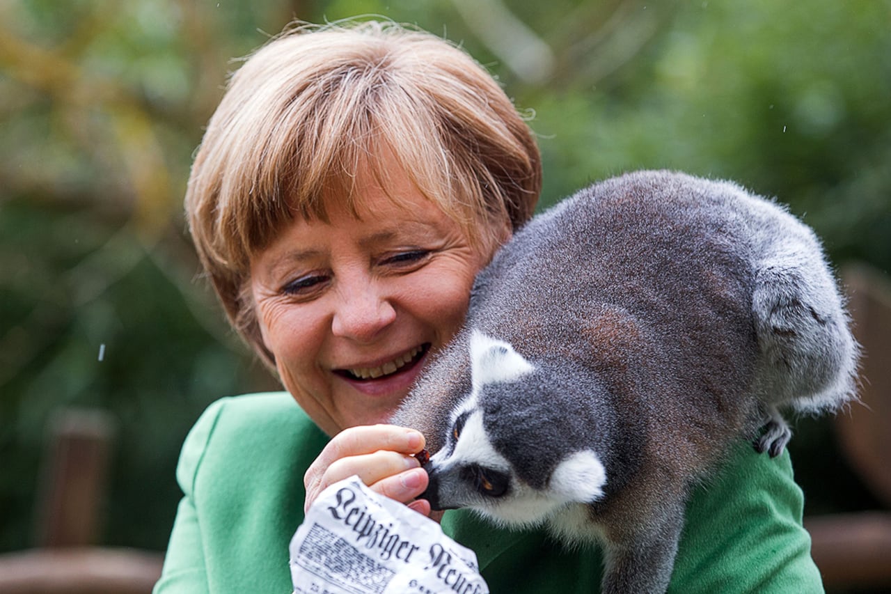 Angela Merkel, canciller alemana, alimenta un lemur que se sentó en su hombro durante una visita al parque Marlow, al norte de Alemania. (AP)
