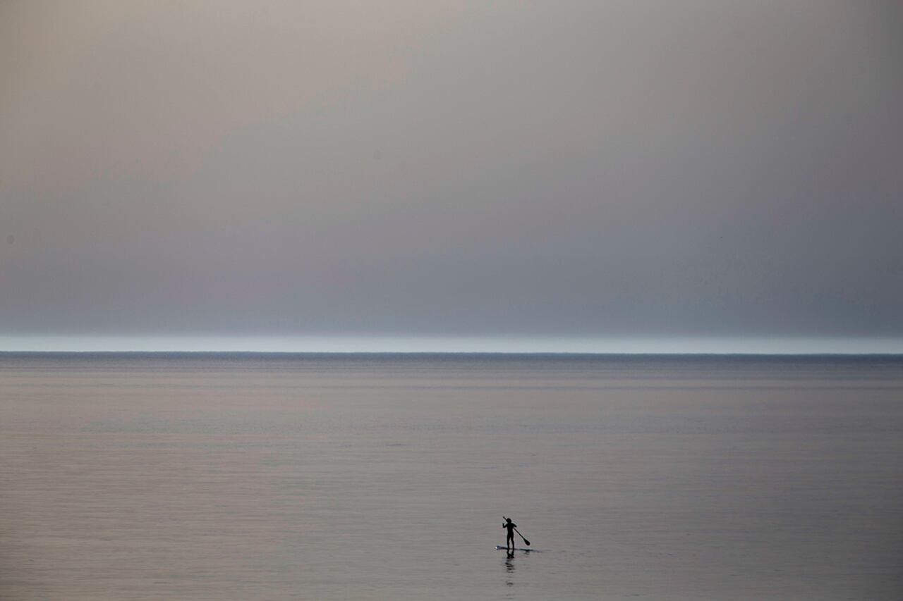 Un surfista rema en el tranquilo y silencioso mar Mediterráneo cerca a la comunidad de Beit Yanai, Israel. (AP)