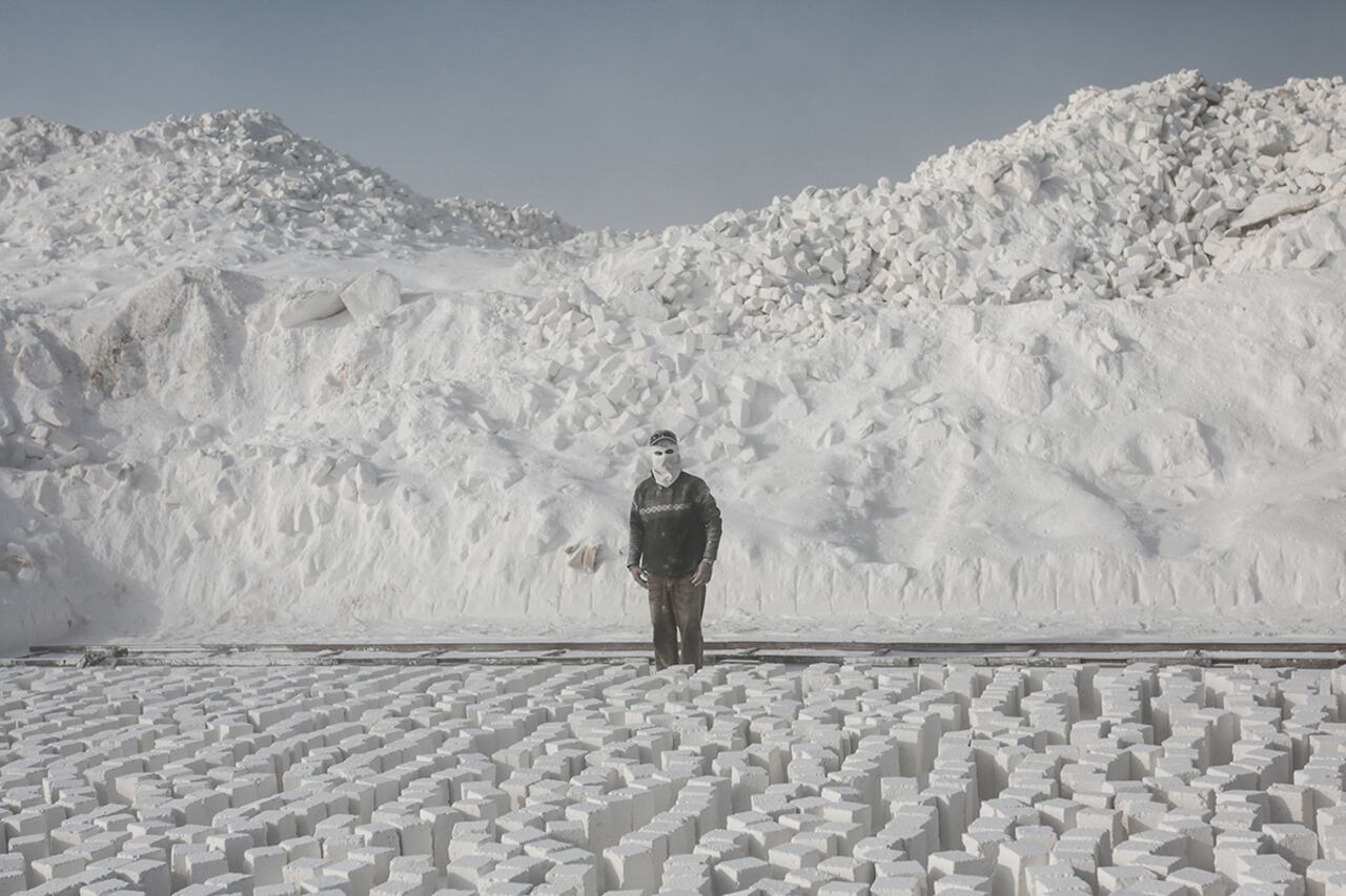 Un hombre, que viste una máscara para proteger sus rostro del polvo, se prepara para recoger piedras recién cortadas de la cantera del desierto de Menia, Egipto. (AP)