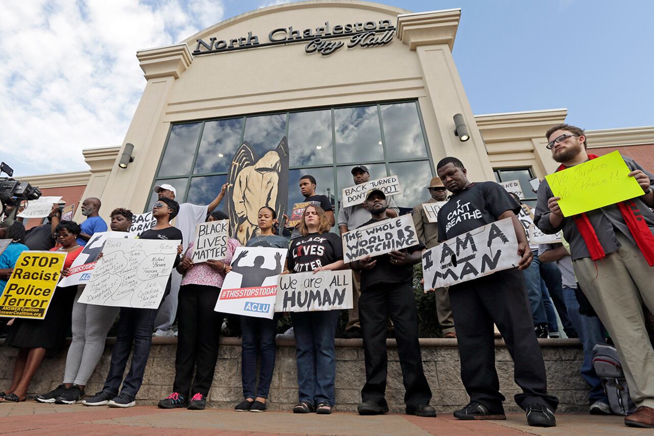 Los manifestantes permanecen en silencio para protestar por el asesinato de Walter Scott por un policía que lo detuvo en el tráfico en Carolina del Sur, EE. UU.. Algunos avisos dicen: "Alto al terrorismo racista policiaco", "todos somos humanos". (AP)