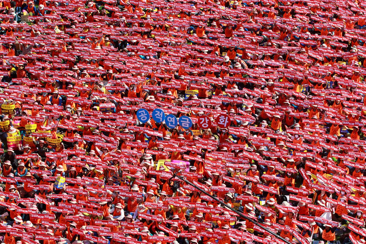 Los miembros de la Confederación de Sindicatos de Corea protestan con carteles que dicen "Vamos a terminar con Park Geun-hye (una política surcoreana del partido conservador Saenuri) y vamos a la huelga general"; en Seúl, Corea del Sur. (AP)