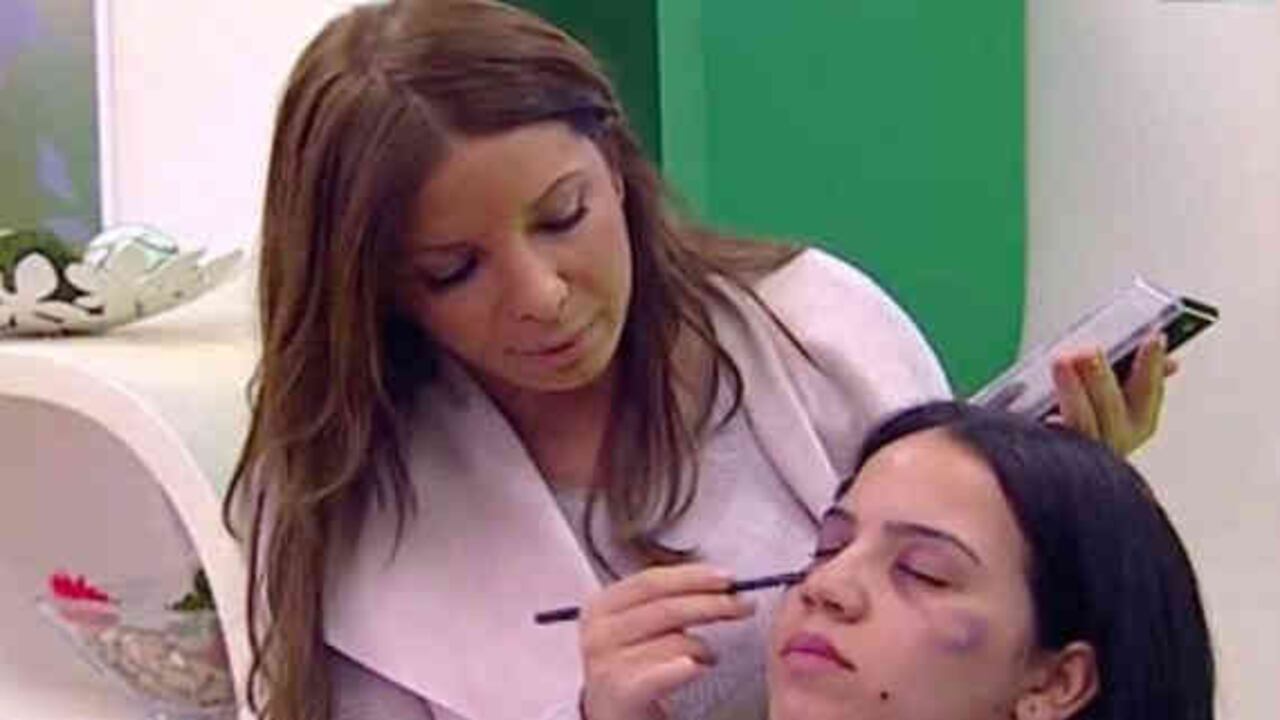 "Esperamos que estos consejos de belleza ayuden en el día a día", dice la maquilladora, mientras cubre el rostro de una mujer visiblemente hinchada y con moretones en su rostro.