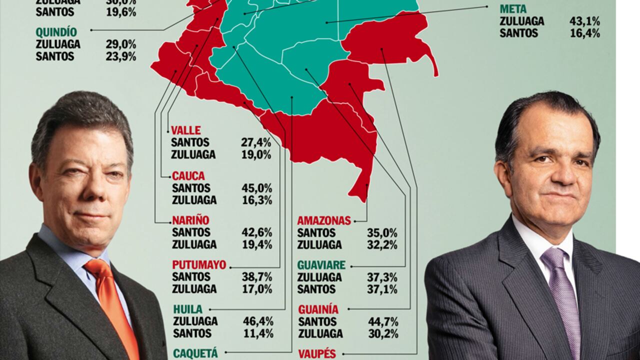 Mientras Óscar Iván Zuluaga ganó en las regiones del centro del país, Santos ganó en los departamentos de la periferia. Apenas 13,2 millones de colombianos salieron el domingo a votar, una de las votaciones más bajas de los últimos tiempos. La abstención fue del 60 por ciento.