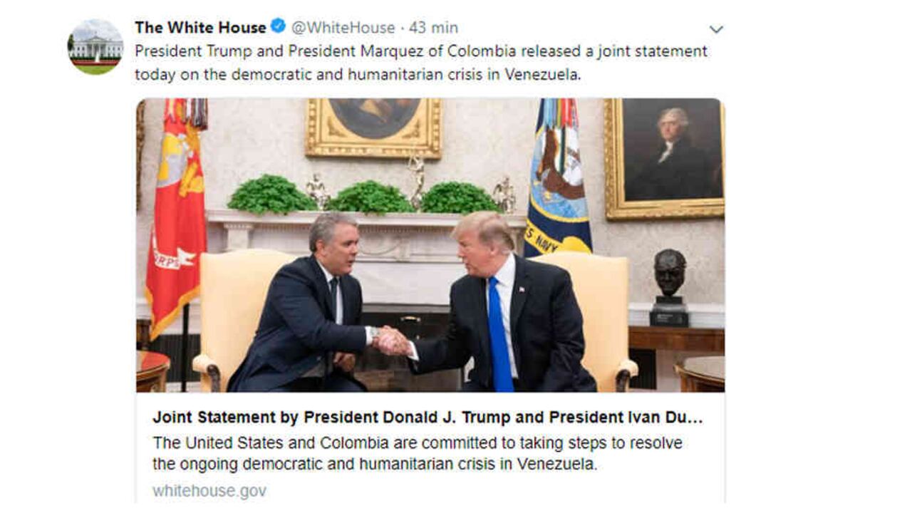 Este miércoles los presidentes Donald Trump e Iván Duque se reunieron en la casa blanca para tratar diferentes temas. La crisis en Venezuela fue tal vez el más relevante, al punto en que ambos mandatarios publicaron una declaración conjunta sobre el tema. Uno de los hechos curiosos de la jornada, fue la publicación que hizo la Casa Blanca en su cuenta oficial de Twitter tras el encuentro. Allí se refirieron a Duque por su segundo apellido y no por el primero como debería ser: "president Marquez of Colombia", dice el trino que muchos achacaron a un descuido de quien maneja la cuenta.