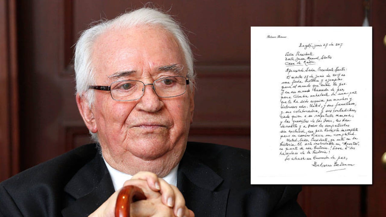 El expresidente Belisario Betancur (1923) le envió una carta al presidente Juan Manuel Santos el pasado martes, el día que las Farc entregaron la totalidad de sus armas para ingresar a la vida civil y la política colombiana.