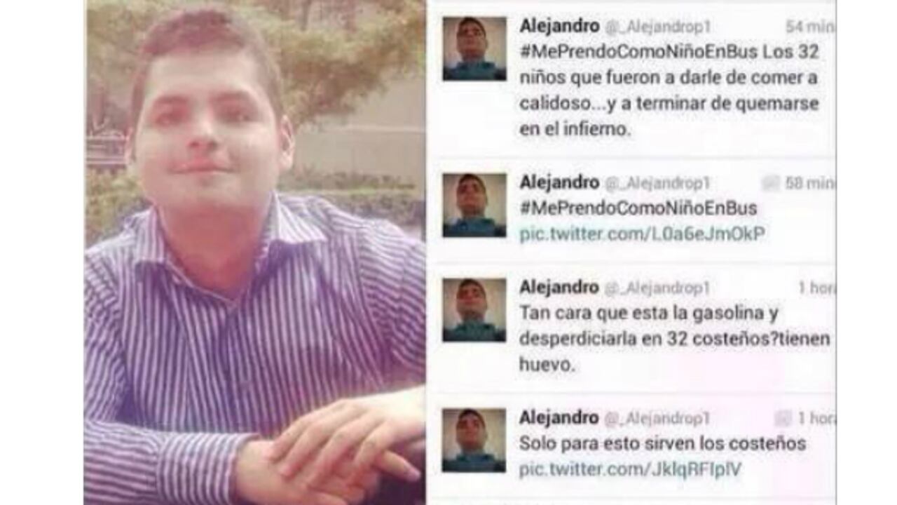 “Tan cara que está la gasolina y desperdiciarla en 32 costeños? tienen huevo (sic)”, escribió el investigado en la red social en la cual aparecía como @_Alejandrop1. Pérez, además, creó un desafortunado hashtag: #MePrendoComoNiñoEnBus.
