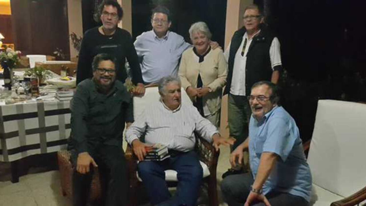 Iván Márquez, quien encabeza el equipo negociador de la organización armada, informó sobre el encuentro en su cuenta de Twitter. "Los uruguayos apoyan proceso de paz de Colombia", escribió Márquez, quien publicó una foto de Mujica sentado en una silla de espaldar blanco, rodeado de los líderes rebeldes.
