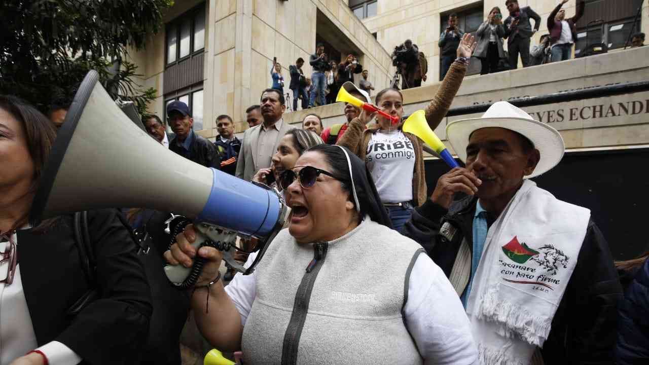 La religiosa Adriana Pérez viajó desde Medellín a acompañar en su indagatoria al expresidente Álvaro Uribe. Desde las escalinatas del Palacio de Justicia, la misionera carmelita se tomó el megáfono de los uribistas para apoyar con euforia al exmandatario: "Él no es ningún paraco, resentidos", gritó la hermana, quien asegura que al jefe del Centro Democrático no le va a pasar nada ya que "Dios lo está respaldando a través de la Iglesia católica".