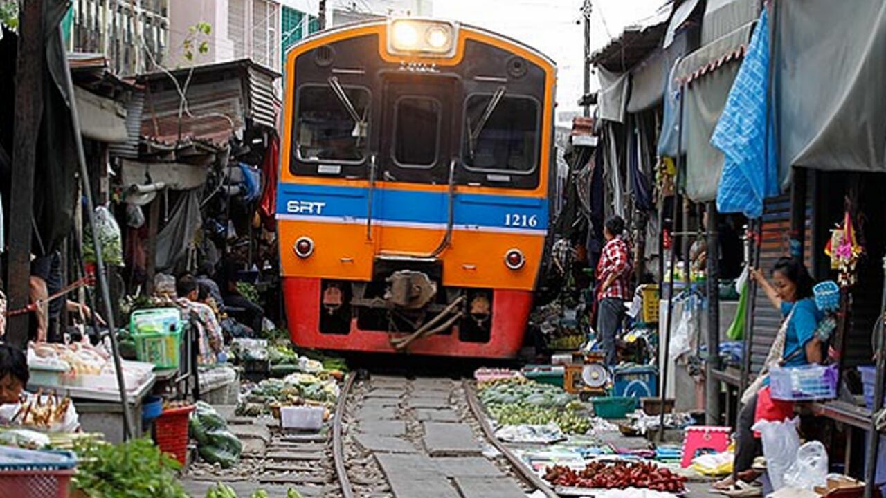 Ir al mercado puede ser algo rutinario pero en el distrito de Mae Klong, en Tailandia, puede llegar a ser una experiencia extrema. Allí mercaderes, turistas y compradores se reúnen junto a las vías del tren, donde se pueden encontrar fruterías, carnicerías, pollerías y pescaderías y hasta puestos de música pirata a centímetros de las vías.