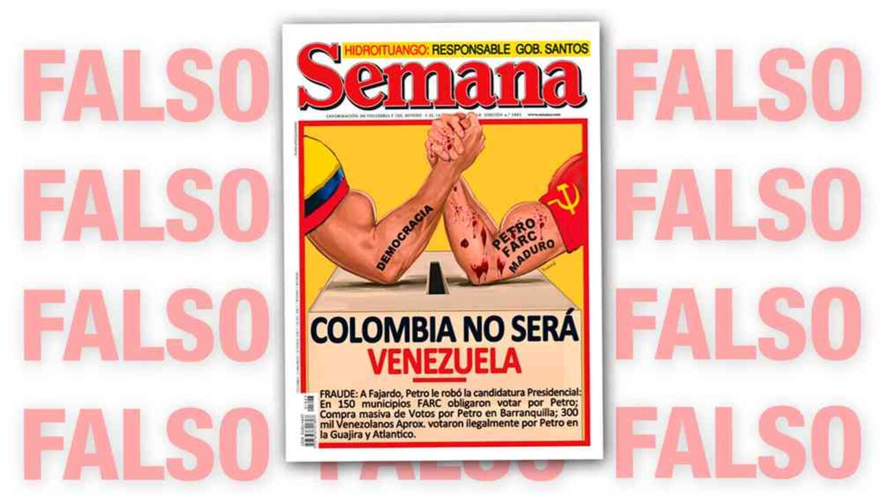 Una nueva portada falsa de la Revista SEMANA está circulando en las redes sociales. En esta ocasión se alteró la más reciente carátula llamada "El último pulso", y se cambió por "Colombia no será Venezuela". La ilustración fue alterada, y acompañada de un texto en el que se habla de un supuesto fraude: "A Fajardo, Petro le robó la candidatura presidencial: en 150 municipios Farc obligaron votar por Petro; compra masiva de votos por Petro en Barranquilla; 300 mil venezolanos aprox. votaron ilegalmente por Petro en La Guajira y Atlántico". SEMANA aclara que este contenido no es verídico.