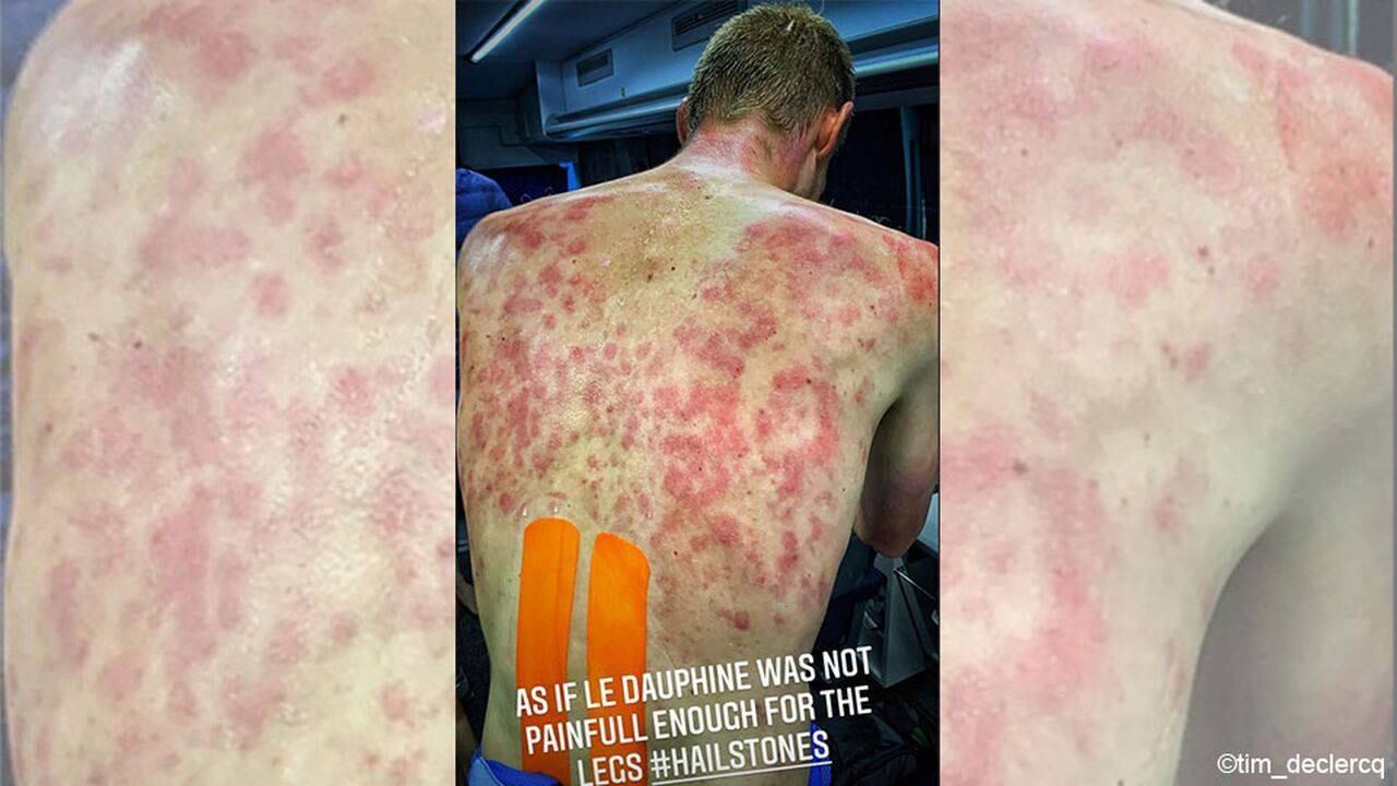 😳 Cuando se dan avisos meteorológicos por fenómenos severos como el #granizo no es solo por los daños materiales que pueda dejar, también por las lesiones que pueda causar. Así ha quedado la espalda del ciclista Tim Declercq tras la etapa de hoy en Col de Porte, #Francia. pic.twitter.com/W89TczkcC3