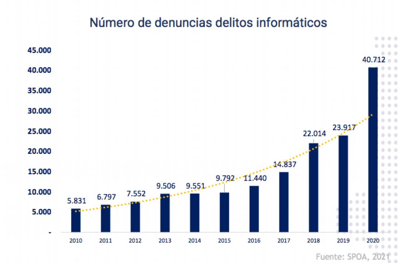 En 2020, el incremento en el número de denuncias por delitos informáticos fue exponencial. Mientras en 2010 eran 5.831, en 2019 ya marcaban 23.917 denuncias. Pero en 2020 la cifra subió a 40.712.