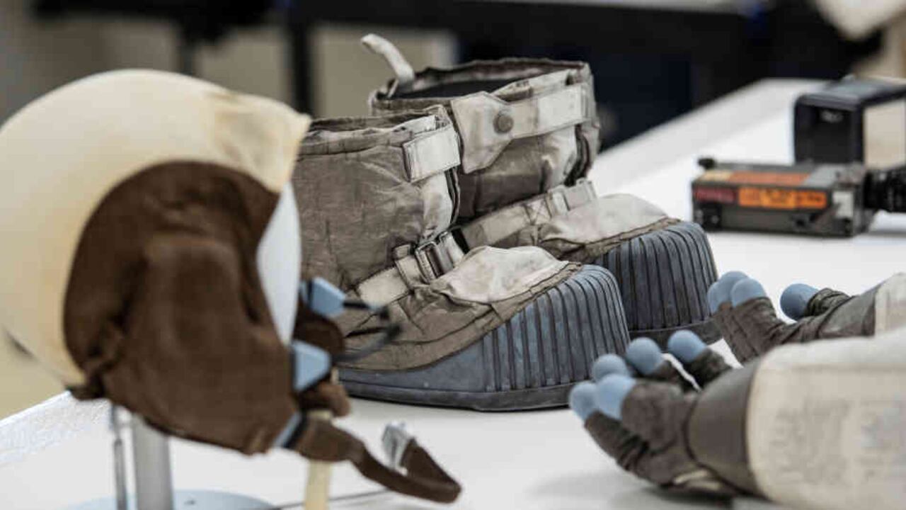 Lewis muestra las botas de fibra de acero y las suelas de silicona azul de Gene Cernan, el último hombre en pisar la Luna en 1972, en el marco de la misión Apolo 17: estuvieron tres largos días en la Luna y conservan de esa estancia un velo negro de suciedad.