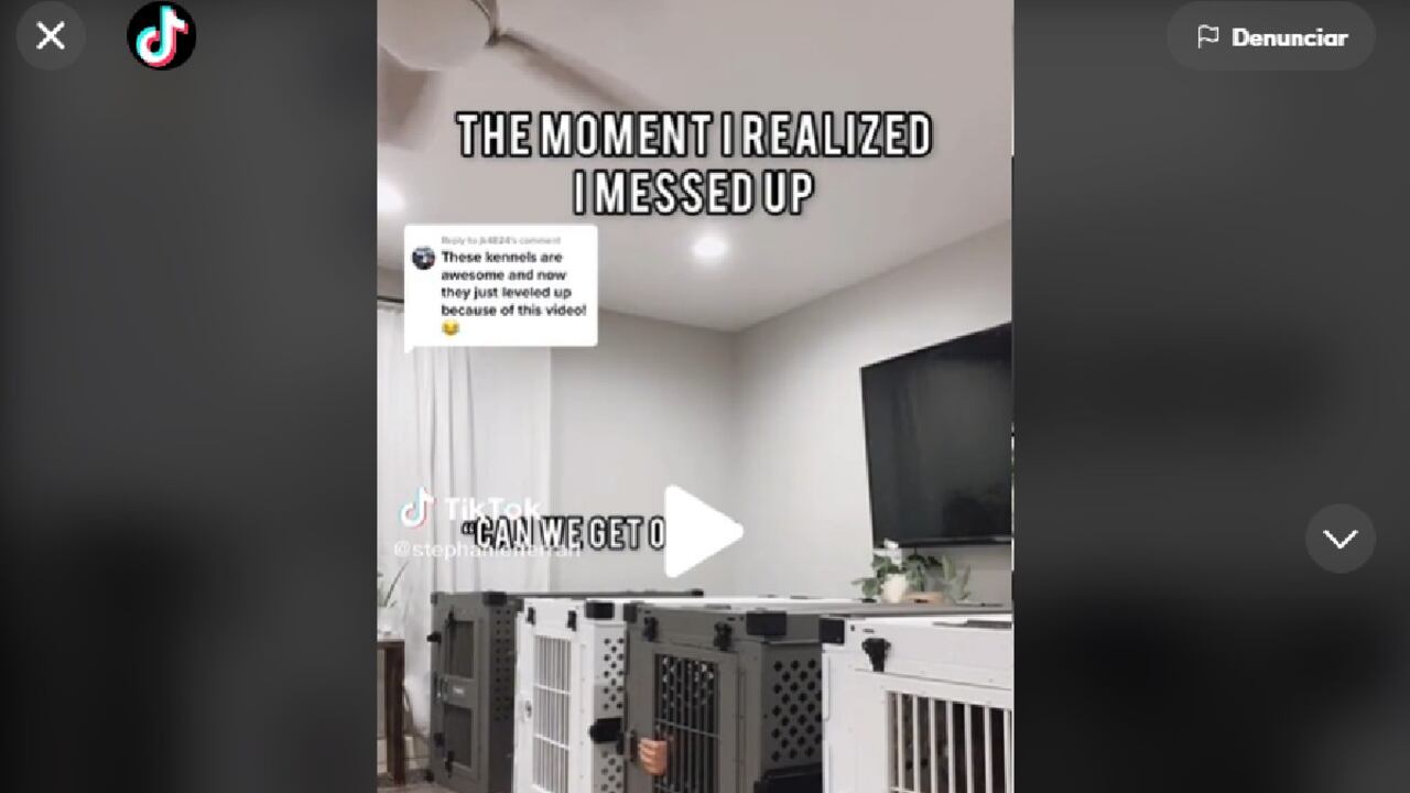 El hecho quedó captado en un clip que se hizo viral en la plataforma y ya cuenta con más de 12 millones de reproducciones. La pareja estaba probando cuatro jaulas para perros para ver cuáles encajaban mejor para sus tres mascotas. Luego de que los perros entraron en sus respectivas jaulas, Stephanie Ferrari, de 25 años, alentó a su esposo Jerry a que también entrara en una.