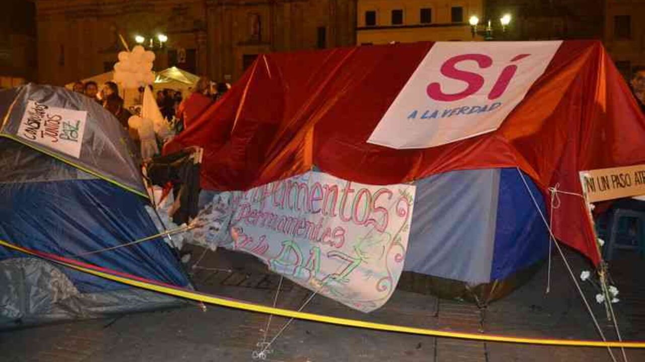 De la euforia colectiva, de las velas y los carteles de la multitudinaria marcha convocada por universitarios en favor de la paz quedó una manifestación permanente. Algunas personas decidieron quedarse en la Plaza de Bolívar a ‘vivir’ en carpas para exigir paz. Primero fueron dos carpas, después siete, hasta que al comienzo de esta semana ya eran más de 50, que albergan un centenar de personas.