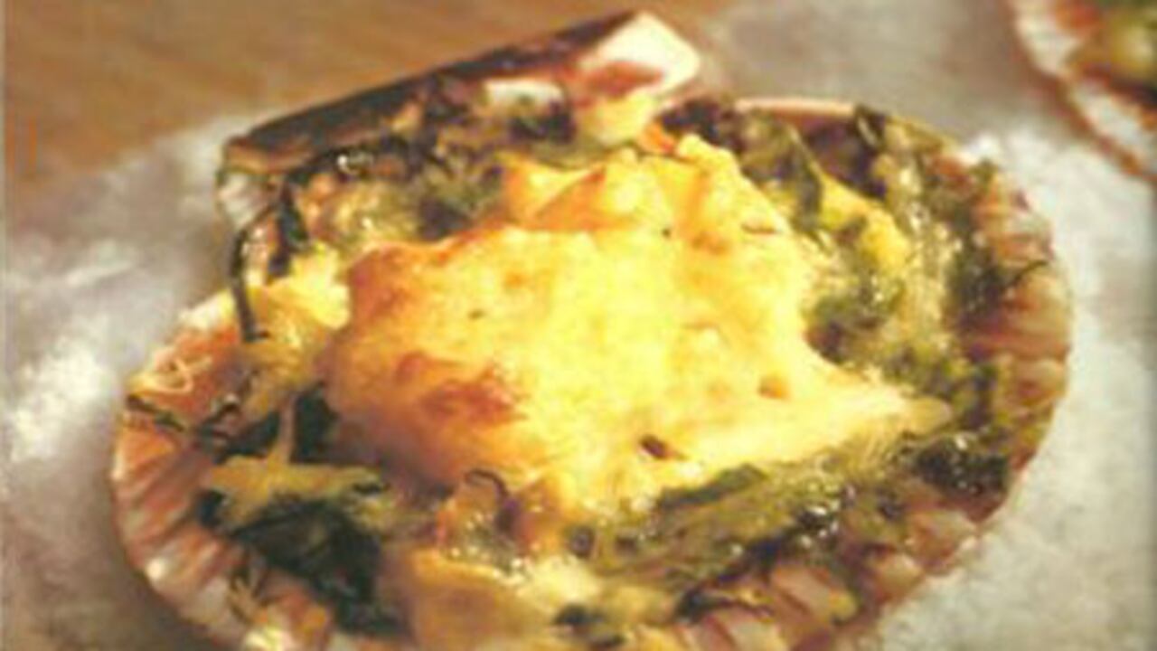 Salpimiente. Deje que las espinacassuelten su agua en la mantequilla caliente y condiméntelas. Lave las ostras y salpimíentelas. Colóquelas en una olla y cubralas con una taza de vino o la champaña. Dejélas hervir,sáquelas y escúrralas. Continúe cocinando el liquido hasta que se reduzca y añádalo a la salsa. Escurra las espinacas y repártalas sobre las conchas limpias y ligeramente calientes. Ponga encima las ostras, cúbralas con la salsa y espolvoree con el queso Gratine, con el horno precalentado a 350°, en el broiler hasta que queden doradas.