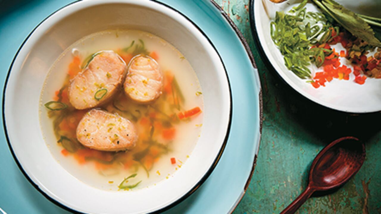 Condimente con sal los cubos de pescado y reserve. En una sartén, caliente 4 cucharadas de aceite. Dore el pescado por todos los lados. En una olla a fuego medio-alto ponga una cucharada de aceite y saltee la cebolla durante 1 minuto. Añada el agua, el cilantro cimarrón y la sal. Cuando hierva, baje el fuego, vierta los cubos de pescado y déjelos cocinar de 5 a 6 minutos. Apague el fuego e incorpore la ralladura de naranja y de limón, el jugo de limón y la panela raspada.