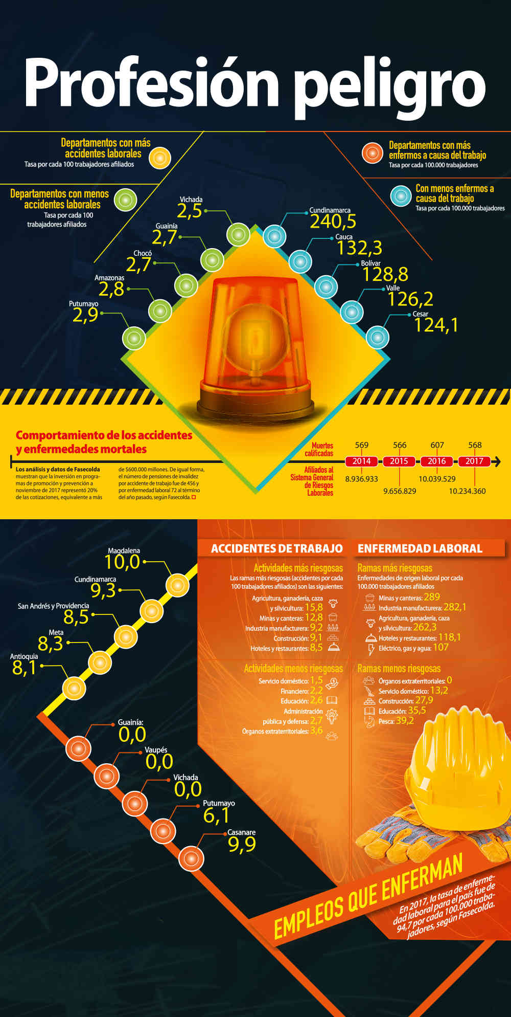 Una reducción de 7% registraron los accidentes laborales en el país en 2017 frente a 2016, según análisis de la Federación de Aseguradores Colombianos (Fasecolda). De acuerdo con el gremio, el número total de accidentes de trabajo al término del año pasado fue de 655.570, mientras el número de enfermedades calificadas como de origen laboral fue de 9.690, dato 8% inferior al registrado en 2016.