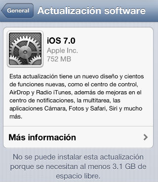 -Si su equipo tiene una versión IOS 5 o IOS6 o inferior, el sistema le pedirá que se actualice. Como en la imagen, el ícono de "Settings" o Configuración mostrará un número 1 en rojo.