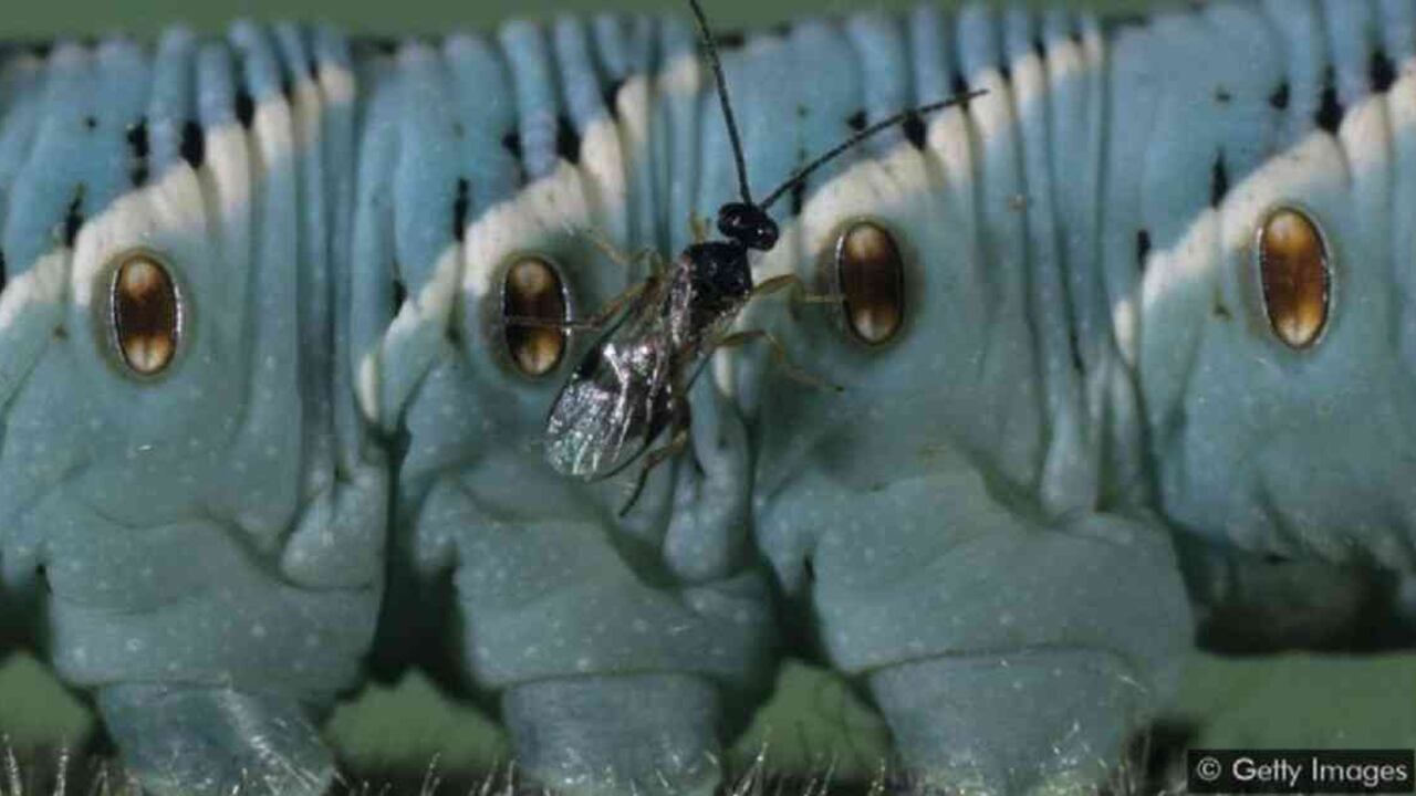 Una avispa parásita (Cotesia congregata) se sube a la parte posterior de una oruga del gusano cuerno del tabaco donde pondrá huevos en el huésped, lo que la mata eventualmente. Foto: Getty Images
