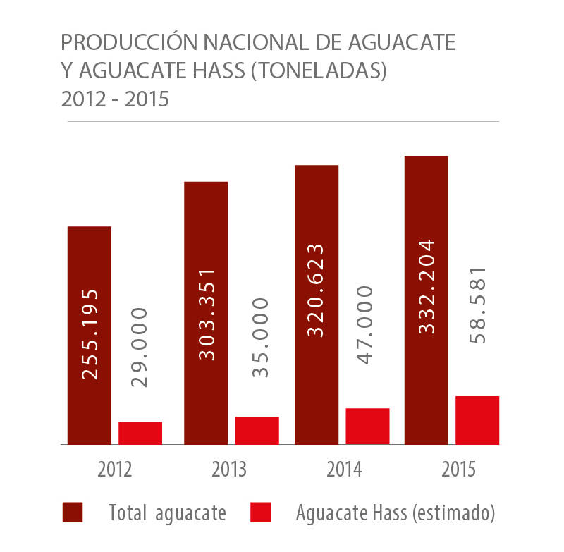 Estos casos de éxito han motivado el crecimiento del cultivo y las exportaciones. Se estima que hay unas 18 firmas vendiendo al exterior y, según las estadísticas de Asohofrucol, gremio de los cultivadores de frutas y hortalizas, al cierre de 2016 se produjeron 78.547 toneladas de aguacate Hass en un área sembrada que llega aproximadamente a 14.084 hectáreas. Los departamentos con mayor potencial de producción son Antioquia (3.500 hectáreas), Caldas (2.597 hectáreas) y Tolima (1.325 hectáreas). Tan solo en Antioquia hay 1.024 productores.
