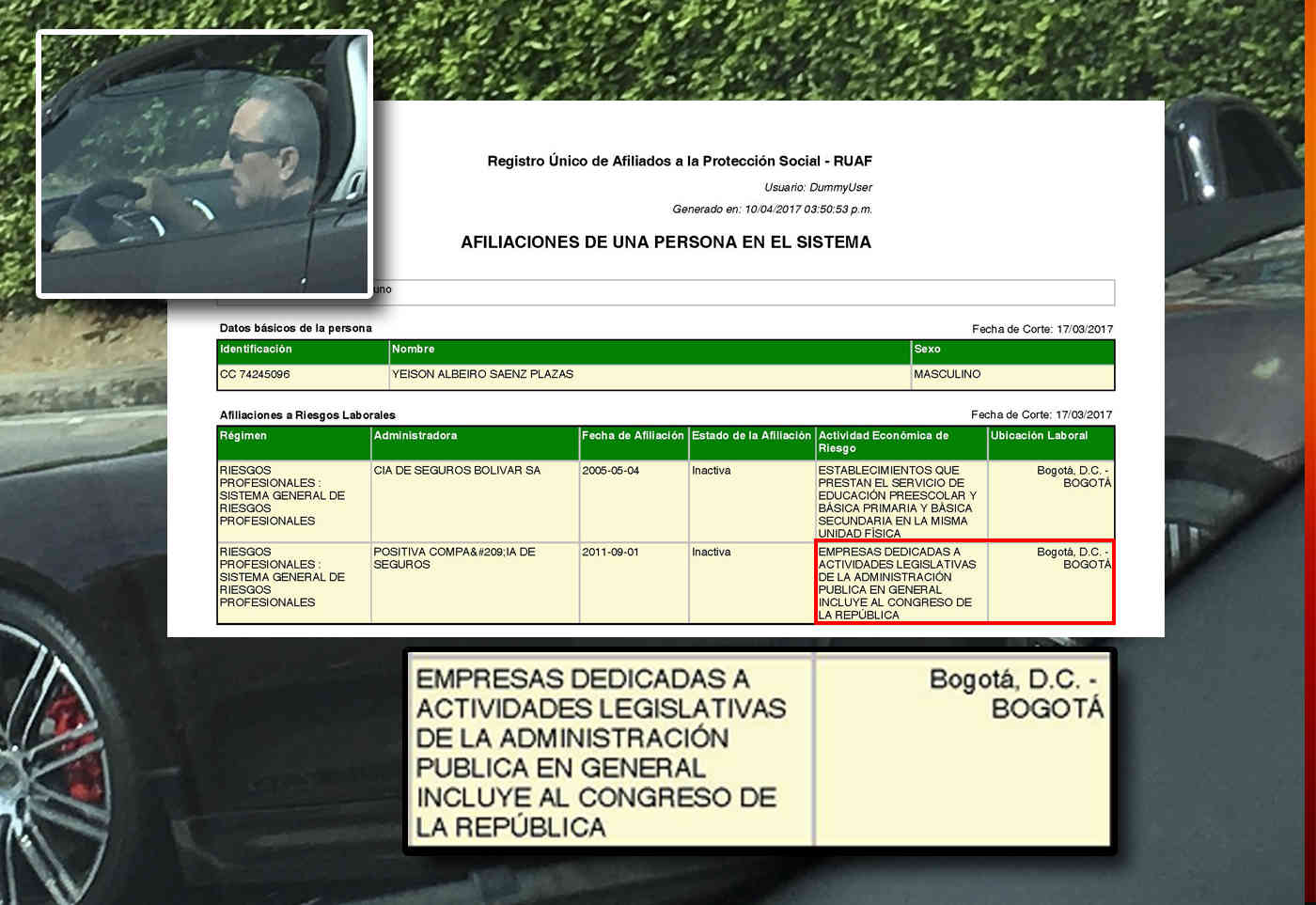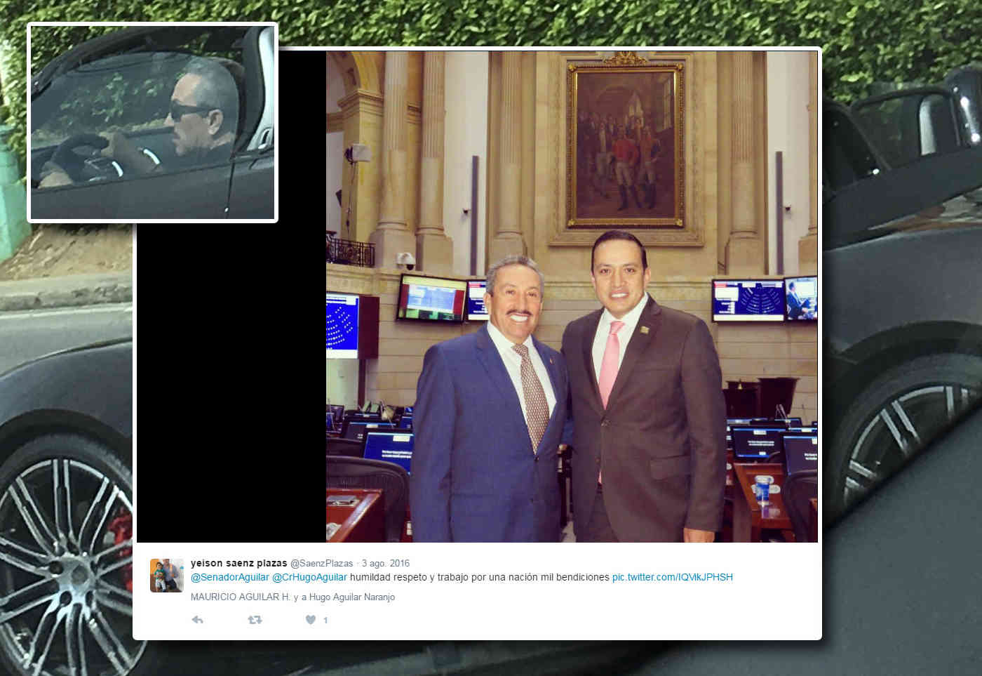 Yeison se graduó hace menos de tres años como ingeniero electrónico de la Universidad Central y su historial de aportes a la seguridad social prueba que antes de convertirse en profesional trabajó –o por lo menos estuvo en la nómina– del Congreso de la República. (Ver paso por el Congreso) Lo que sí exhibe en sus cuentas en las redes sociales es una devota admiración por el coronel Hugo Aguilar, condenado a nueve años de prisión por la parapolítica, y por su hijo el senador Nerthink Mauricio Aguilar. Cuando Hugo Aguilar estuvo en la cárcel, Yeison publicó un mensaje exaltando a quien llama “excelente ser humano y amigo” en donde asegura que “aunque pongan barrotes, muros y montañas; tus ideales, honestidad y palabra jamás serán prisioneros”. (Vea el post de Facebook) Un trino suyo presenta al coronel Aguilar abrazando a su hijo, el senador Aguilar en el interior del Capitolio. El comentario del buen Yeison es “humildad respeto y trabajo por una nación mil bendiciones”. (Ver comentario en Twitter)