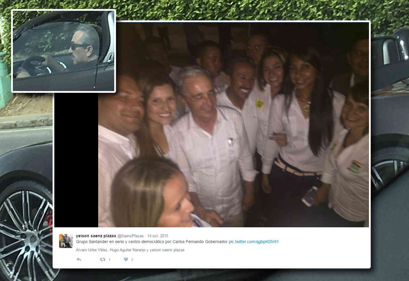 Otro tuit retrata al coronel Aguilar junto al expresidente Álvaro Uribe impulsando la fallida candidatura de Carlos Fernando Sánchez a la Gobernación de Santander: “Grupo Santander en serio y centro democrático por Carlos Fernando Gobernador”. (Ver tuit sobre la campaña)