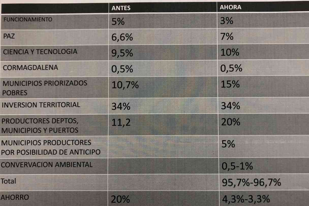 Para funcionamiento, las regalías que antes eran del 5%, ahora serán del 3%; para la paz se pasó de 6,6% a 7%; ciencia y tecnología de 9,5% pasó a 10%; Cormagdalena quedó igual (0,5%), municipios priorizados pobres, pasó de 10,7% a 15%, inversión territorial quedó igual (34%); departamentos productores , municipios y puertos, de 11,2 a 20%; municipios productores por posibilidad de anticipo 5% (Nuevo); conservación ambiental entre 0,5-1% (Nuevo). En total las regalías aumentarán, de ser aprobada la iniciativa, entre 95,7% a 96,7%.