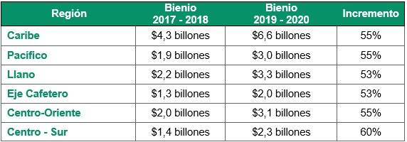Con respecto al bienio anterior, todas las regiones del país recibirán más recursos por regalías, impulsando la equidad y el desarrollo. Si se tienen en cuenta específicamente los recursos destinados a inversión, estos serán los más altos de los últimos 8 años, al pasar de $12,6 a $18,4 billones de pesos, cifra que representa un crecimiento del 46%.