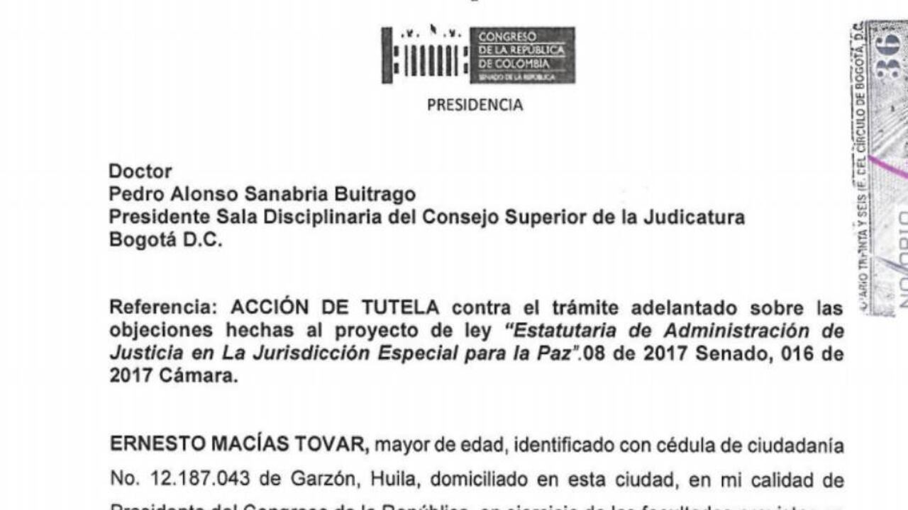 A su vez, Macías justifica la tutela basado en que en algunos artículos de la Constitución indican que cuando un proyecto de ley es objetado por el jefe del Estado, debe regresar a la cámara de origen, es decir, el Senado.