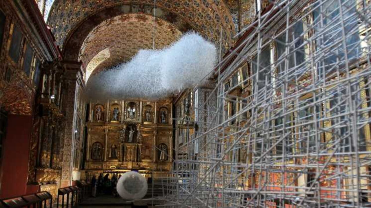 Un domingo, en el taller, me di cuenta, no sé por qué, de que todos los elementos que hay en el taller son líneas, casi que todas las esculturas son hechas con líneas: líneas, hilos de acero, que construyen volumen. Yo quería que el dibujo y la línea fuera un elemento importante en la exposición, no quería ningún elemento distractor, la iglesia ya tiene mucho color, más que suficiente. Desde el comienzo decidií que las obras fueran blancas. Hasta ahora la luz en la iglesia ha funcionado muy bien, pero de pronto habría que resaltarla un poco, sobre todo con la Nube y el Nido. La luz cambia la apariencia de las nubes y las nubes cambian la apariencia de la luz. En determinados momentos, la luz crea una escena muy bonita en la Nube y le da mucho volumen.