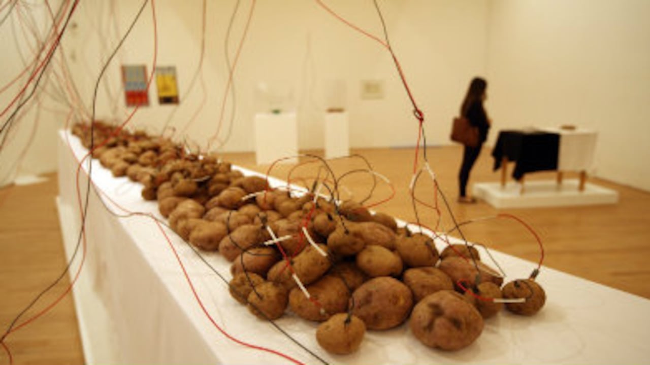 Uno de los primeros núcleos de la muestra son las papas. “Víctor fue químico de formación. Él acude al medio del arte, donde ya existe una resignificación del objeto. En parte de su obra, él trabajó los alimentos en relación al hombre. La papa americana aparece en todas sus variedades. El la utilizó en su propia alimentación y después le fue sugiriendo cosas. Él está dando un nuevo significado a un objeto humilde y lo sitúa en una condición simbólica, capaz de hacerse humano, y tomar conciencia de sí mismo”, dice Chillida.