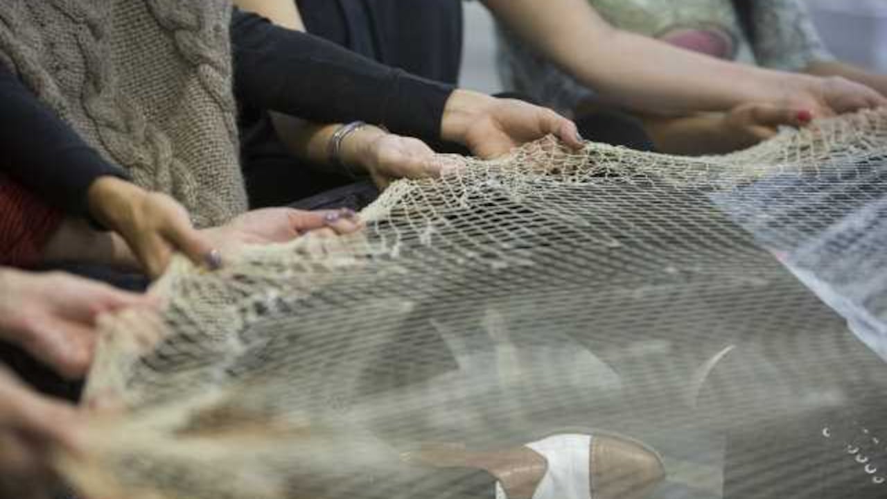 Para la lectura de Atarraya el último fragmento, Caycedo, invitó a las personas que estaban sentadas en el círculo a que levantaran la atarraya y la siguieran tejiendo: cruzando los brazos, entre ellos, uno sobre el otro. Todos sostuvieron y tensaron la atarraya. Leyó partes de los testimonios de personas que participaron en una de las geocoreografías en Pitalito, Huila. Estas son algunas de las historias que fueron leídos por la artista: