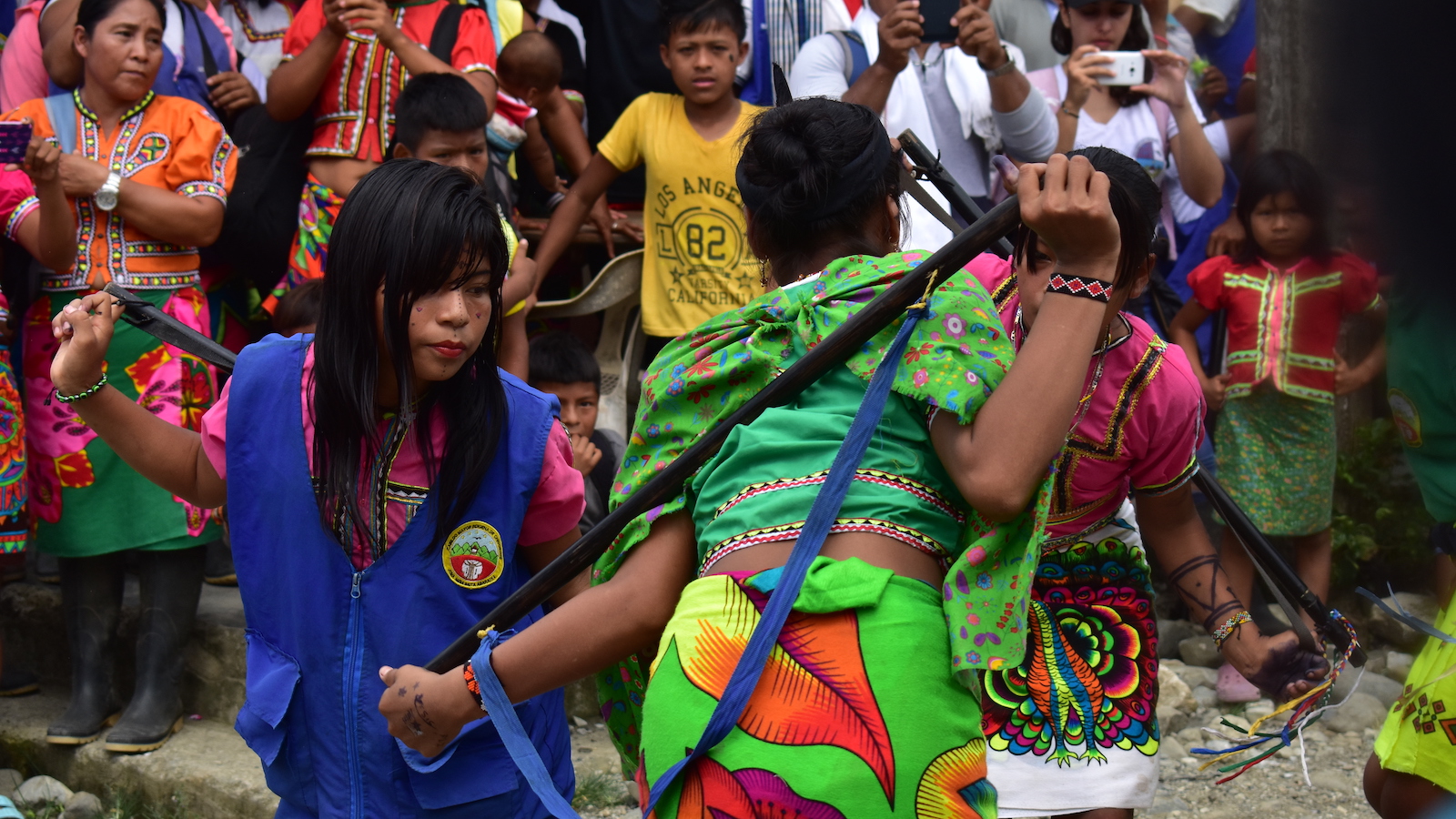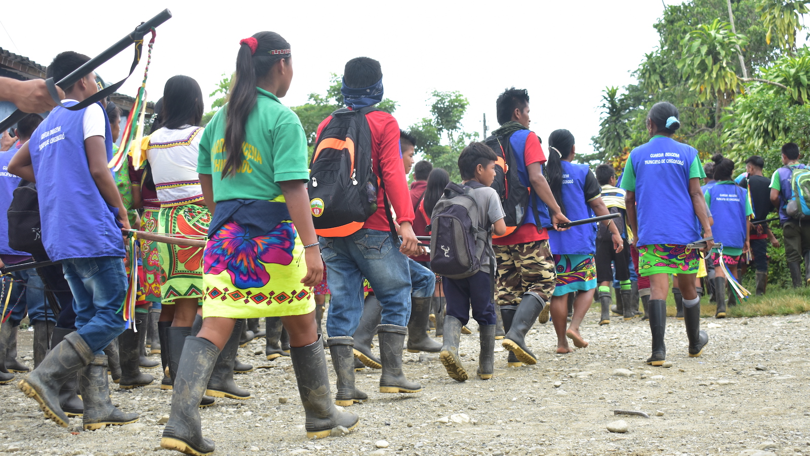 Al mediodía la guardia, con sus chalecos azules, empezó a colmar el corregimiento. Los indígenas, antes de subir hasta el centro poblado, se detuvieron, se organizaron en fila, compartieron sus bastones y los agarraron formando una especie de barrera humana para dirigir al grupo. Frente a ellos estaba un parlante en el que sonaba el himno de la guardia indígena, que algunos tarareaban mientras esperaban que llegaran los demás: ¡Guardia, guardia! ¡Fuerza, fuerza! por mi raza, por mi tierra, se escuchaba cantar.