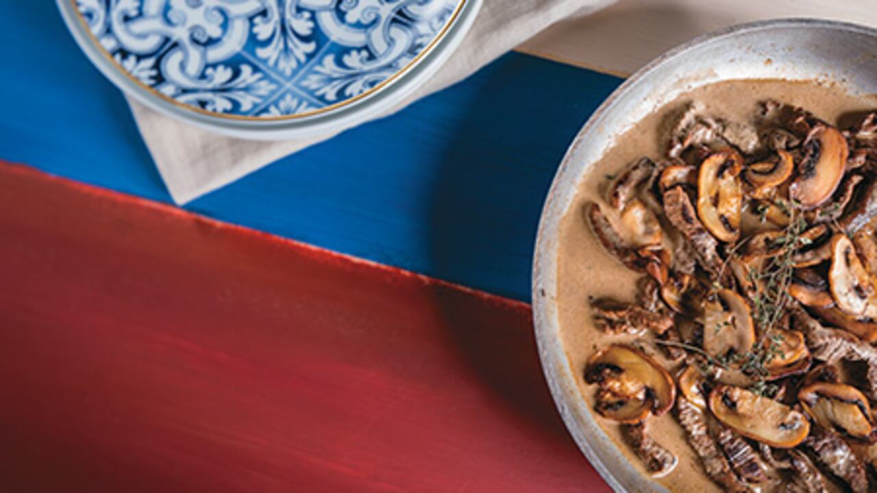 Caliente una sartén de fondo grueso y vierta dos cucharadas de aceite. Dore la carne por tandas y sazone con sal y pimienta, luego reserve. En la misma sartén dore la cebolla con el resto del aceite e incorpore los champiñones. Cocine con tapa por un par de minutos adicionales. Vierta el caldo, baje el fuego a mínimo y deje por 8 minutos. Agregue la mostaza, revuelva bien e incorpore la carne. Deje que se cocine por unos 5 minutos y retire. Fuera del fuego agregue sour cream y revuelva. Sirva caliente.