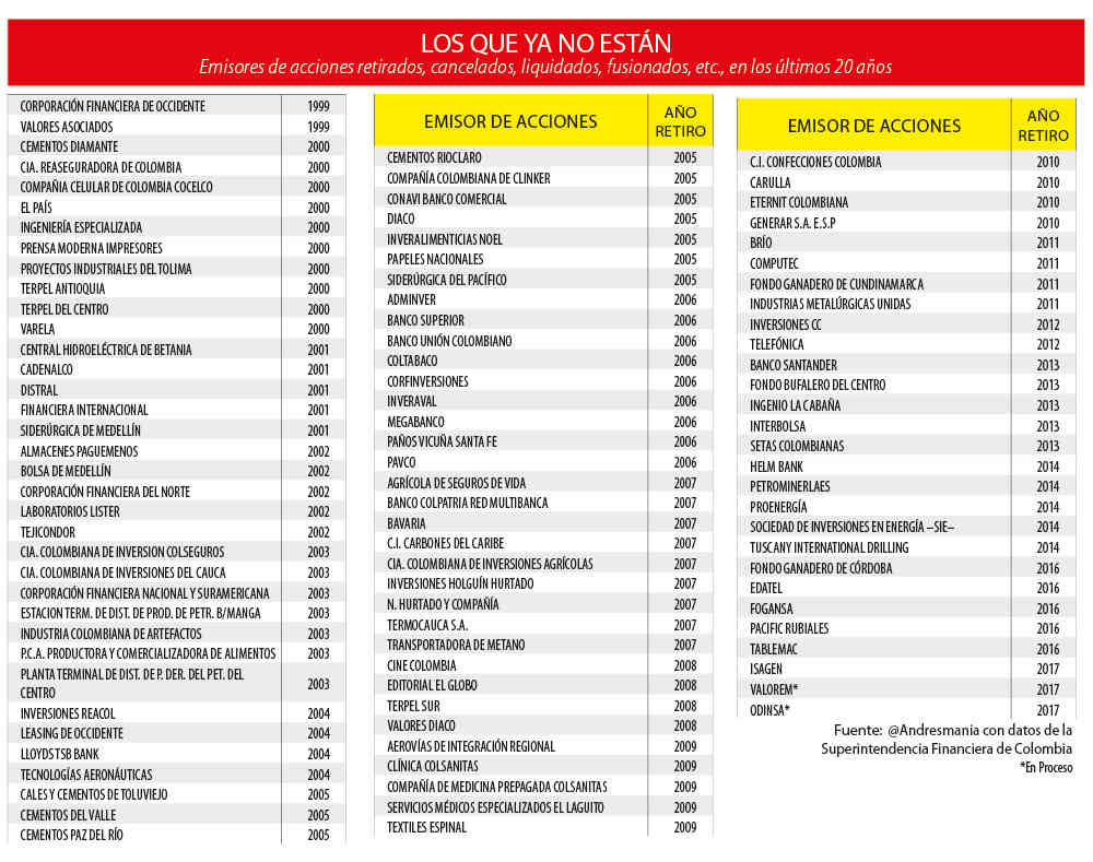 Andrés Moreno, especialista en acciones, lleva la cuenta de las personas naturales que han abandonado el mercado. Menciona casos como Avianca, que desde su emisión en 2011 ha perdido 11.778 socios, es decir 75%; la acción preferencial de Grupo Sura, que entre diciembre de 2011 a junio de 2017 pasó de tener 20.891 accionistas a 6.465; la preferencial de Cementos Argos, que desde 2012 ha perdido 67% de sus socios, etc. De hecho, en el último año, 74.000 personas salieron de sus acciones.