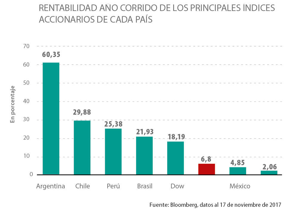 Además, las acciones nacionales se valorizaron 19% en promedio en 2016 y la expectativa era que este año ese dato fuera superior. Sin embargo, la valorización de enero a noviembre, al cierre de esta edición, apenas iba en 7%, cifra inferior a la esperada y por debajo de la rentabilidad que muestran las principales bolsas latinoamericanas.