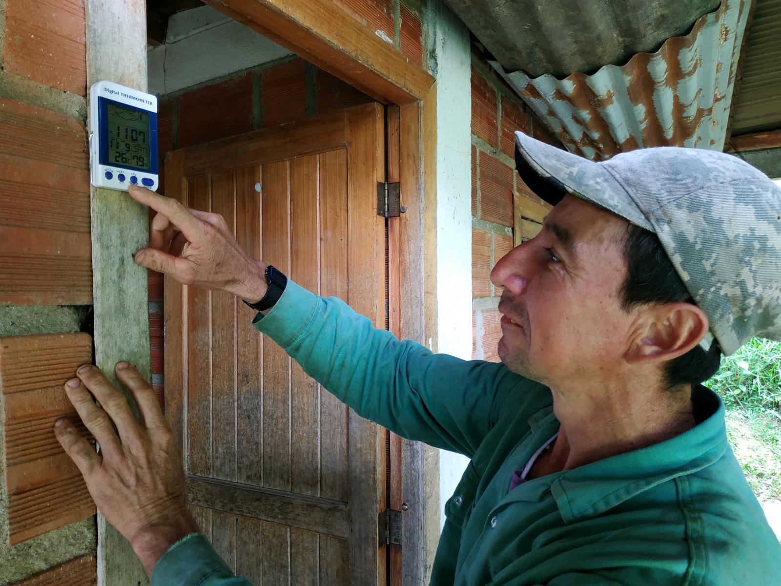 Dos veces al día, en la mañana y en la tarde, Carlos prende un aparato para conocer la temperatura y la humedad de su finca. ©Jhon Barros