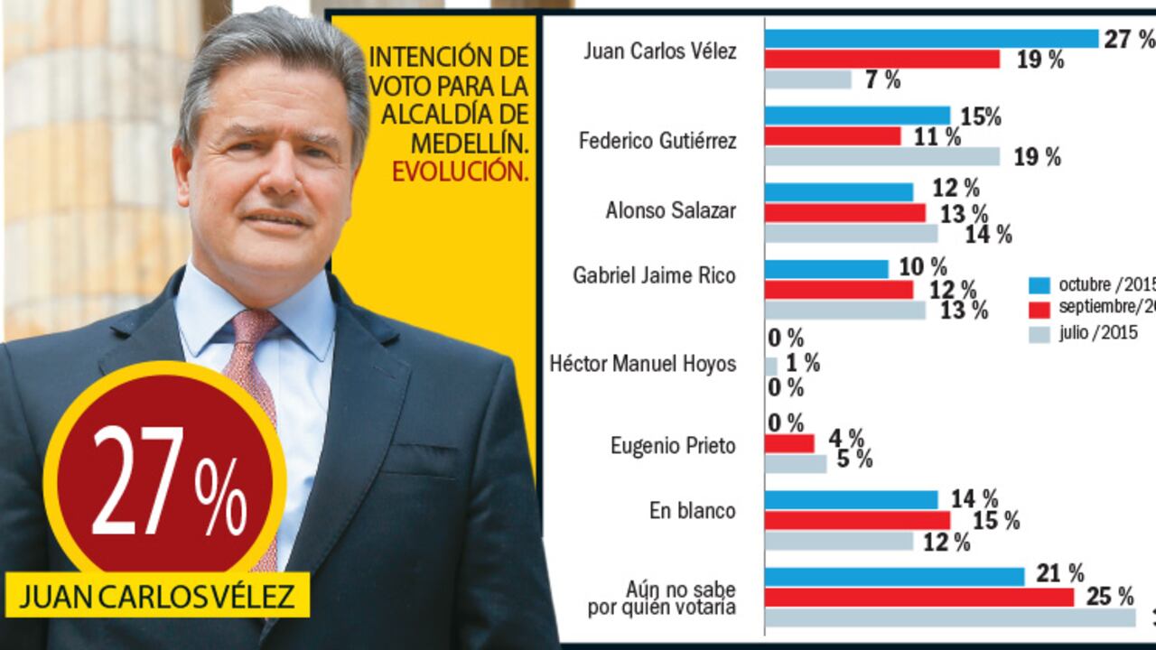 ¿Está asegurada la elección de Vélez? La mayoría de los argumentos están a su favor. Las tendencias lo empujan. Las estadísticas esenciales, también. A sus estrategas solo les deben preocupar dos reflexiones. La primera, que las encuestas en Medellín han fallado: es el lugar del país donde menos capacidad de acierto han demostrado. Y la segunda, que en general los encuestados tienen un nivel muy alto de desconocimiento de todos los candidatos. Incluso un 32 por ciento de los paisas no conoce a Alonso Salazar, quien ya fue alcalde y ha estado en primera línea del protagonismo local. Y a Vélez, aunque va adelante, no lo reconoce un 49 por ciento de la ciudad (aunque su nivel de conocimiento ha aumentado).